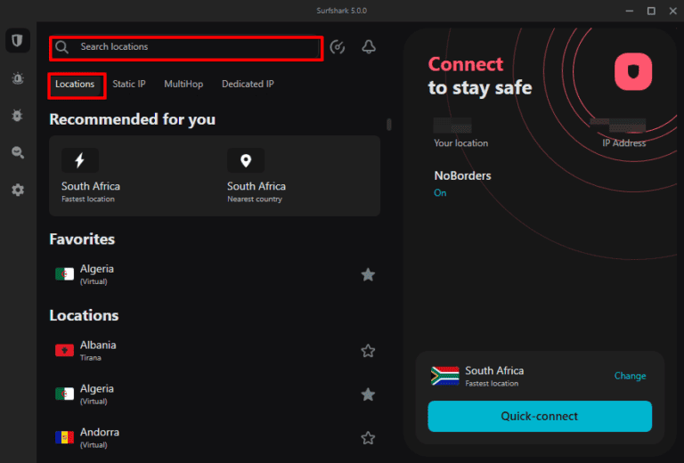 - Alternativ gehen Sie zu „Standorte” für die vollständige Liste der Surfshark-Server, oder geben Sie Ihren bevorzugten Surfshark VPN-Serverstandort in die Suchleiste ein und stellen Sie eine Verbindung her.