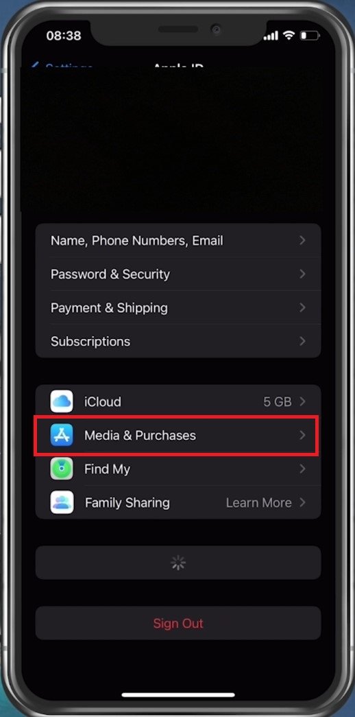 Tippen Sie auf IhrApple-IDGeben Sie den Namen ein und tippen Sie dann aufMedien & Einkäufe.
