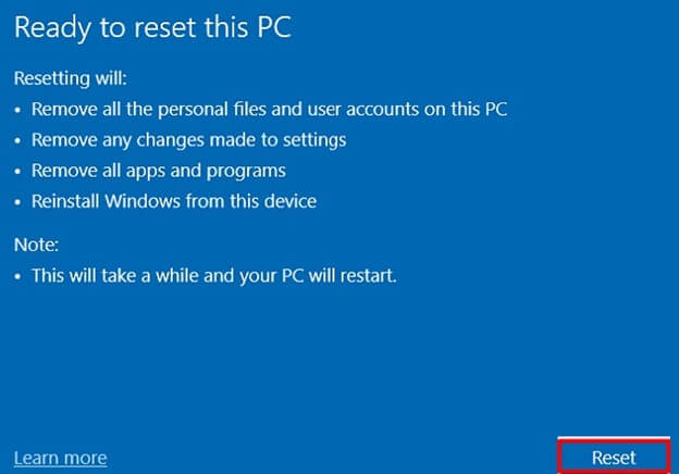Um den Vorgang zu bestätigen, klicken Sie auf „Zurücksetzen”Lösung Nr. 5: RAM prüfen oder ersetzen