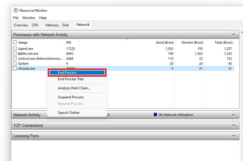 ImNetzwerkÖffnen Sie die RegisterkarteProzesse mit Netzwerkaktivität,und nach ein paar Sekunden sehen Sie jeden Vorgang, der Ihre Netzwerkverbindung nutzt. Dies kann daran liegen, dass Ihr Browser im Hintergrund läuft, Steam oder ein Download, der Ihre Verbindung blockiert. Ich schlage vor, dass Sie nur die Prozesse beenden, von denen Sie wissen, dass sie Ihr Betriebssystem nicht beschädigen.