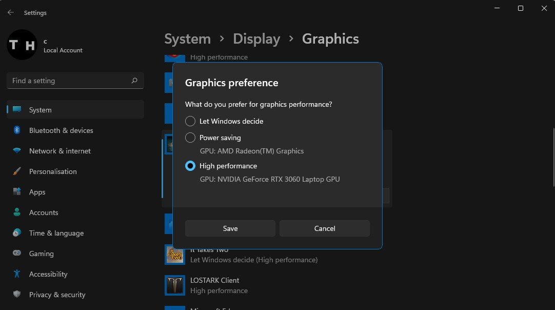 Für die größtmögliche Systemleistung verwenden Sie dieHochleistungOption. Wenn Ihre GPU Ihre Leistung beeinträchtigt, sollten Sie sie auf einstellenLassen Sie Windows entscheiden. Vergessen Sie nicht, Ihre Änderungen zu übernehmen.