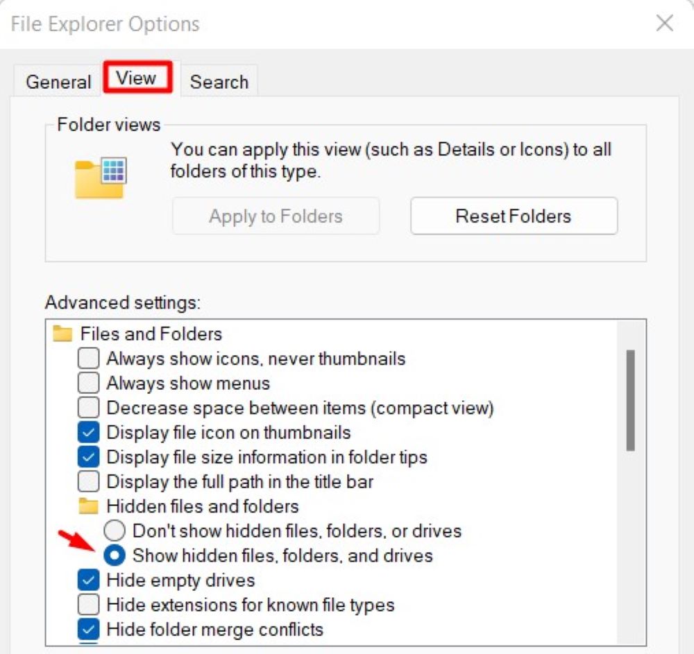 Schritt 15:Unter demSichtTab, suchen Sie nach„Versteckte Dateien, Ordner und Laufwerke anzeigen“und verwenden Sie den Cursor, umKlicken Sie auf den Kreis daneben. Bei korrekter Ausführung erscheint in diesem Kreis ein schwarzer Punkt.