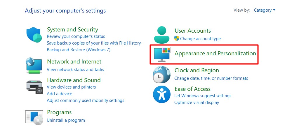 Sobald sich die Systemsteuerung öffnet, navigieren Sie mit dem Cursor zuAussehen und Personalisierung(befindet sich auf der rechten Seite der Seite) und klicken Sie darauf.