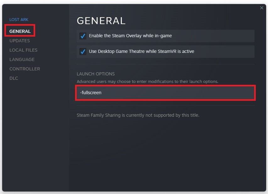 ImAllgemeinRegisterkarte, die Sie verwenden könnenStartoptionen, das sind Befehle, die ausgeführt werden, wenn Sie das Spiel starten. Nutzen Sie die Startoption-Vollbild. Dadurch wird Lost Ark gezwungen, im Vollbildmodus zu starten, was dazu beigetragen hat, die Probleme einiger Spieler zu beheben.