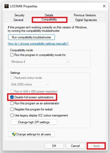 Ändern Sie die Kompatibilitätsoptionen für Lost Ark