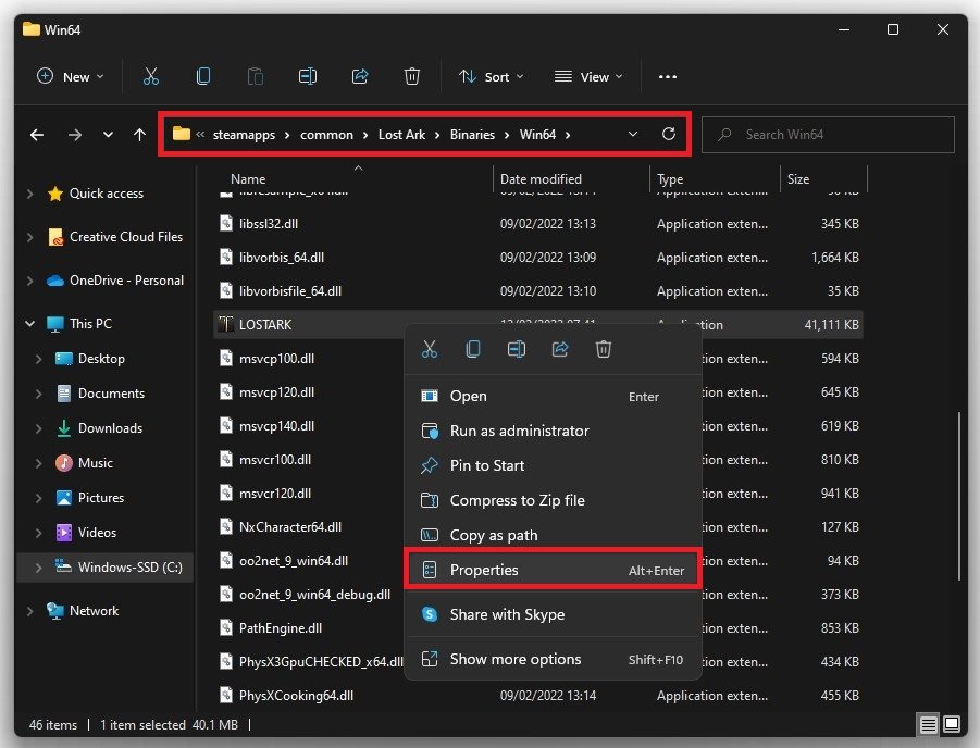 Öffne deineDatei-Explorerund navigieren Sie zu dem Laufwerk, auf dem Sie das Spiel gespeichert habenProgrammdateien>Dampf>Steamapps>gemeinsam>Verlorene Arche>Binärdateien>Win64. Klicken Sie mit der rechten Maustaste aufLOSTARK.exeAnwendung und gehen Sie zu seinerEigenschaften.