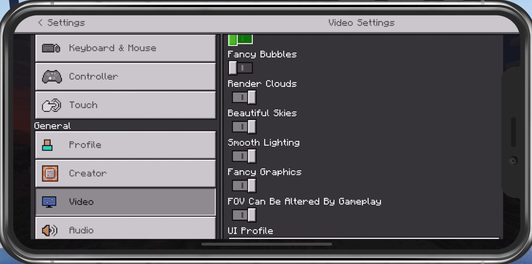 Wir erhöhen gerne meineSichtfeldvom Standardwert auf etwa 90 Grad. Im Folgenden werde ich diese Einstellungen für Geräte der unteren bis mittleren Preisklasse vornehmen. Wenn Sie ein High-End-Mobilgerät verwenden, möchten Sie möglicherweise einige davon später erhöhen. DeaktivierenAusgefallene Blasen, und gehenWolken rendernaktiviert, wenn sie Sie nicht stören, da sie Ihre Leistung nicht stark beeinträchtigen: DeaktivierenWunderschöner Himmel,Sanftes Lichtg auch, alsAusgefallene Grafiken. Unten können Sie Ihre ändernBenutzeroberflächenprofilVon der Pocket-Edition bis zur klassischen Version, wenn Sie das bevorzugen.