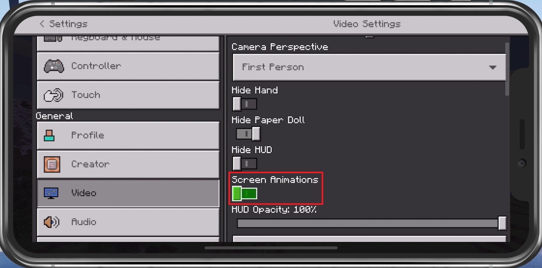 ImVideoStellen Sie die meisten davon nach Ihren Wünschen ein, da sie nur minimale Auswirkungen auf die Leistung Ihres Geräts haben. Dazu gehört auch IhrHelligkeit, wodurch der Akku nur dann entladen wird, wenn diese Option höher eingestellt ist. DeinKameraperspektive,Hand verstecken,Papierpuppe,UndHUDsollte am besten auf der Standardeinstellung belassen werden. Um die größtmögliche Leistung zu erzielen, insbesondere in großen Welten oder soNether, erwägen Sie die DeaktivierungBildschirmanimationen.