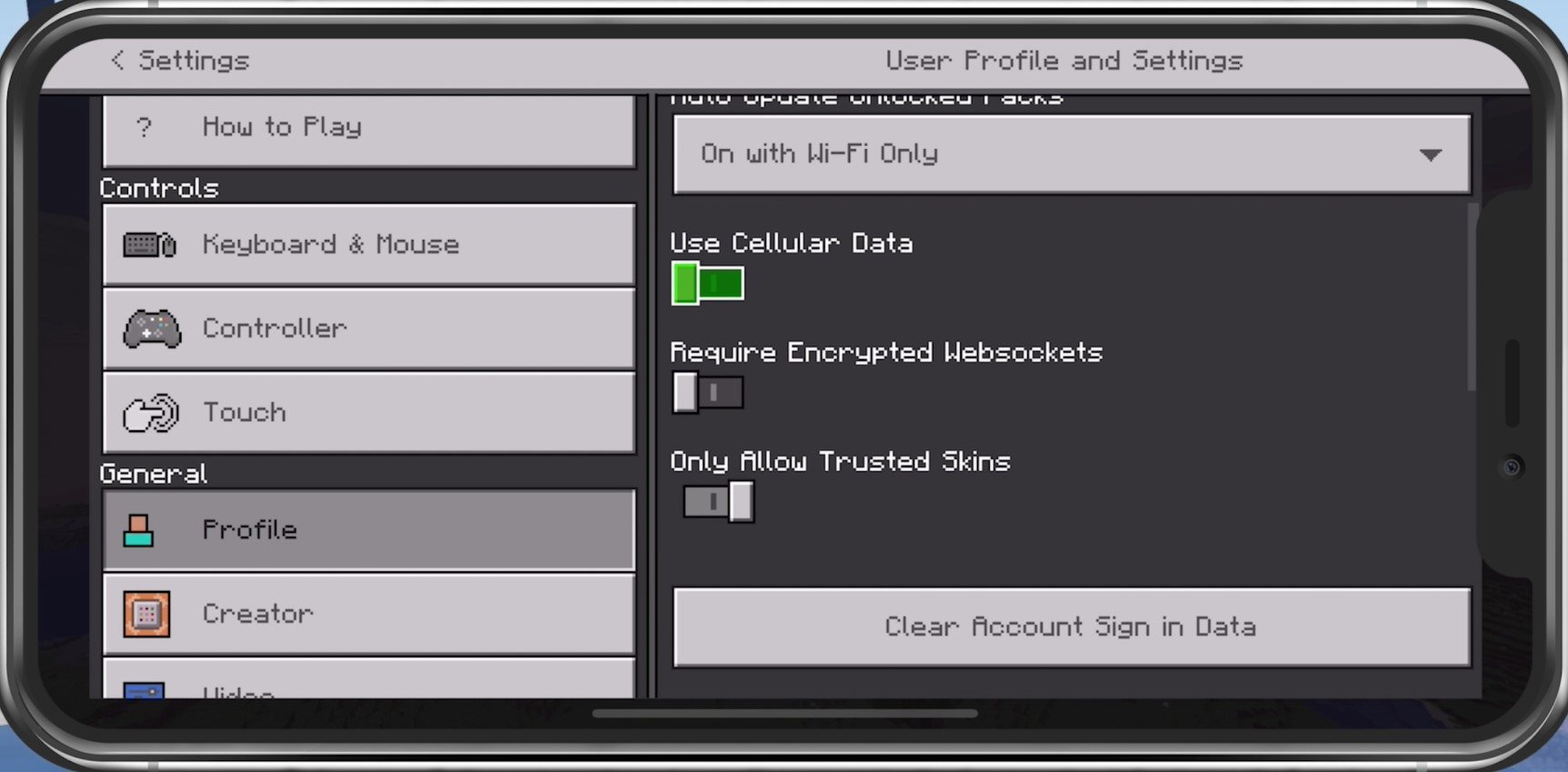 Minecraft Pocket Edition-Einstellungen > Profil > Mobilfunkdaten verwenden