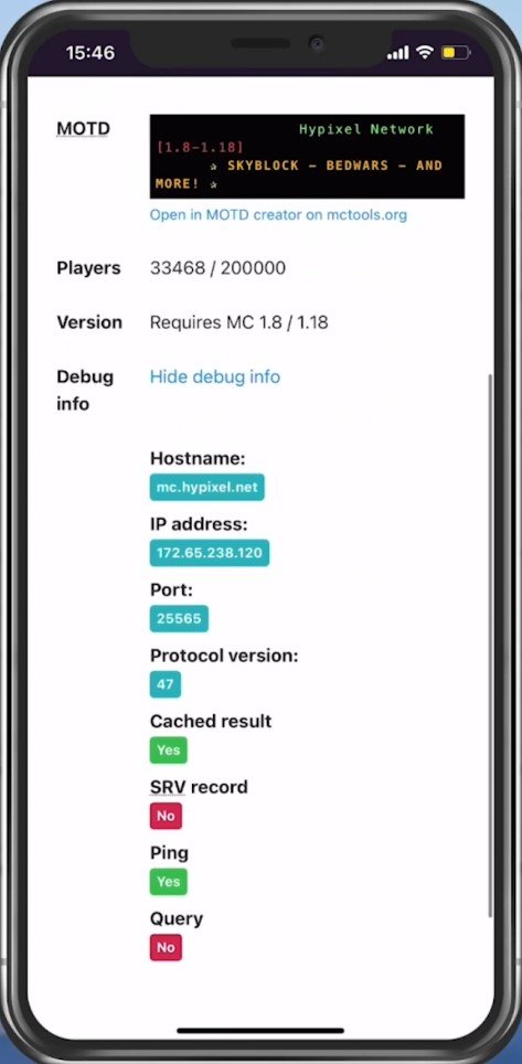 Nach einer Sekunde können Sie eine Vorschau anzeigen, ob der Server online und betriebsbereit ist, wie viele Spieler derzeit auf dem Server spielen, welche Minecraft-Version zum Spielen auf diesem Server erforderlich ist, den Hostnamen, die IP-Adresse usw.