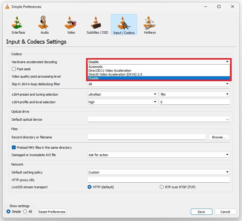 Erweiterte VLC-Einstellungen > Eingabe/Codecs