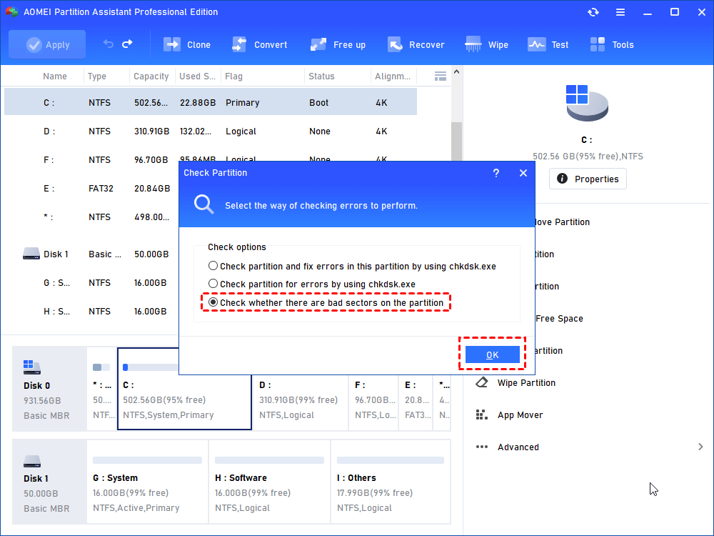 Oder Sie können einfach IEMOA Partition Assistant verwenden, um beschädigte Dateisysteme mit einem Klick zu überprüfen und zu reparieren. Das Tool bietet einige erweiterte Funktionen zum Überprüfen des Festplattenzustands. Sie können Festplattenoberflächentest, Partition prüfen oder Eigenschaften und Zustand verwenden, um die Festplattenleistung zu verbessern und das Windows-System zu beschleunigen: