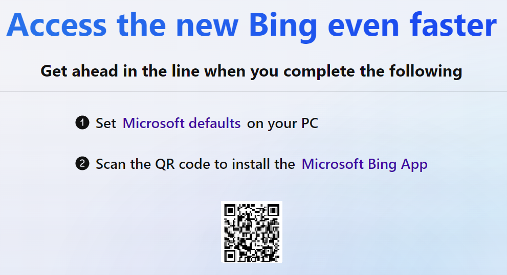 Klicken Sie aufGreifen Sie schneller auf das neue Bing zu. Sie werden aufgefordert, die Microsoft Bing-Suche als Standardsuche in Ihrem Browser festzulegen, indem Sie eine Browsererweiterung von Microsoft installieren. Als Nächstes können Sie den QR-Code auf Ihrem Bildschirm scannen, um die neueste Microsoft Bing-Anwendung auf Ihr Gerät herunterzuladen, eine neue und verbesserte Version der ursprünglichen Suchmaschine, jetzt mit Chat.