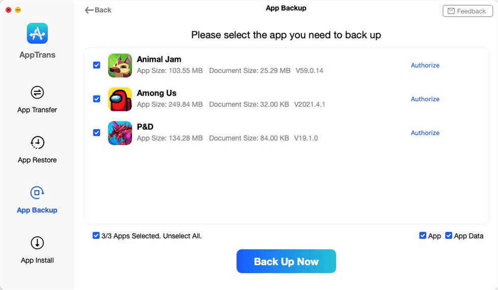 Schritt 1. Starten Sie AppTrans auf Ihrem Computer > Wählen Sie im linken Bedienfeld die Option „App-Backup“ und klicken Sie dann auf die Schaltfläche „Jetzt sichern“.