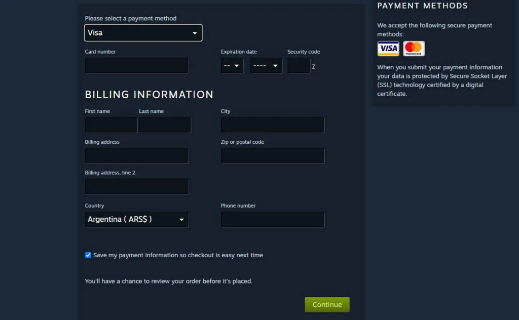 - Verwenden Sie eine lokale Zahlungsmethode: Steam erfordert, dass Ihre Zahlungsmethode mit dem Land Ihrer Rechnungsadresse übereinstimmt. Das heißt, wenn Sie die Steam-Region ohne VPN wechseln möchten, müssen Sie eine lokale Kreditkarte oder eine andere Zahlungsmethode verwenden, die in dem Land registriert ist, in das Sie umgezogen sind. Dieser Schritt ist von entscheidender Bedeutung, da Steam das mit Ihrer Zahlungsmethode verknüpfte Land überprüft, um zu verhindern, dass Personen regionale Preise ausnutzen.