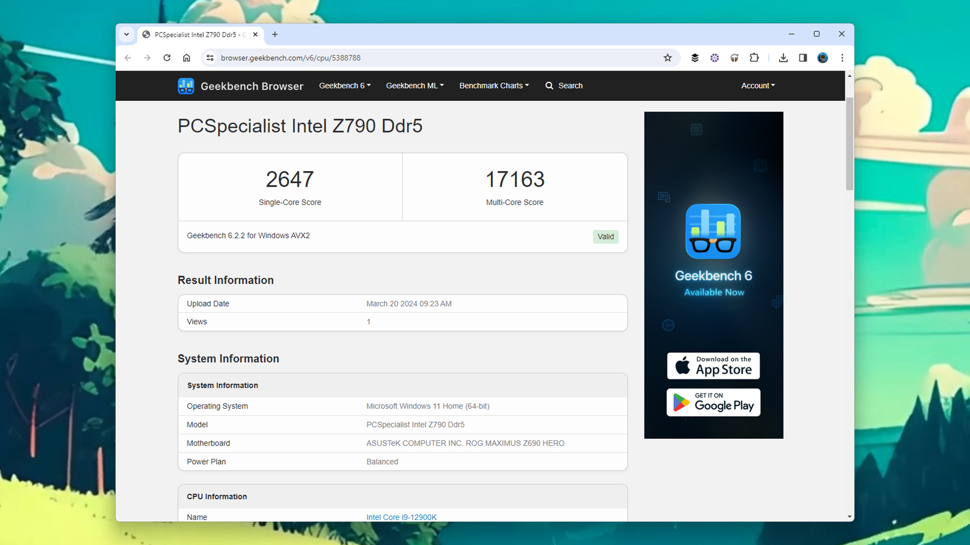 Geekbench zeigt seine Ergebnisse in einem Browserfenster an. Screenshot: Geekbench