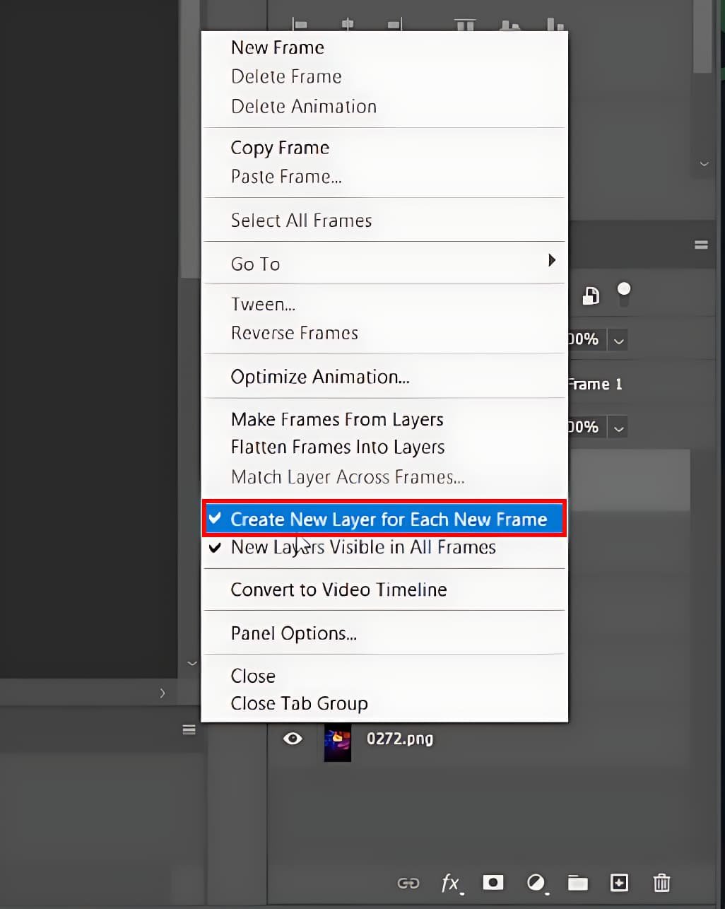Erkennen Sie als Nächstes das Linientrio im oberen rechten Segment des Zeitleistenfensters. Klicken Sie, um eine Reihe von Optionen anzuzeigen, und wählen Sie „Für jeden neuen Frame eine neue Ebene erstellen“. Gehen Sie zurück in das Menü und wählen Sie die Funktion „Rahmen aus Ebenen erstellen“ und bereiten Sie so die Bühne für ein nahtloses GIF-Erstellungserlebnis mit Photoshop.