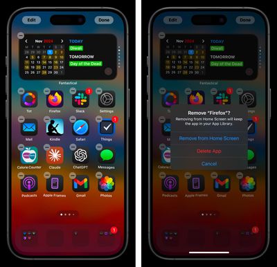 Die andere Möglichkeit, zu diesem Bildschirm zu gelangen, besteht darin, eine beliebige Stelle auf dem „Startbildschirm“ gedrückt zu halten. Dadurch wackeln alle sichtbaren Symbole und zeigen an, dass Sie sich jetzt im Anpassungsmodus des „Startbildschirms“ befinden. Tippen Sie auf das Minus-Symbol in der oberen linken Ecke des App-Symbols, um die beiden oben beschriebenen Optionen anzuzeigen.