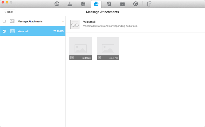 Schritt 3: Klicken Sie auf Nachrichtenanhänge und wählen Sie Voicemail aus. Wählen Sie die Elemente aus, die Sie löschen möchten, und kehren Sie zur Ergebnisseite zurück. Klicken Sie auf die Schaltfläche „Bereinigen“, um die Voicemail auf dem iPhone dauerhaft zu löschen.
