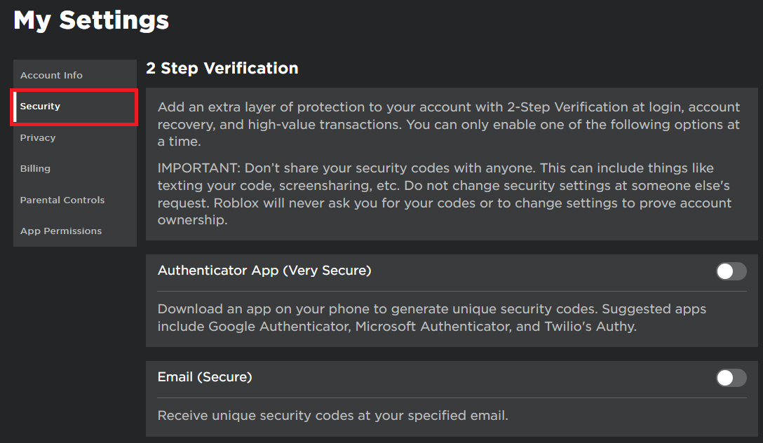 Kann ich die Bestätigung in zwei Schritten auf Roblox später wieder aktivieren?Ja, Sie können die Bestätigung in zwei Schritten jederzeit über die Registerkarte „Sicherheit“ in Ihren Kontoeinstellungen wieder aktivieren und so diese zusätzliche Sicherheitsebene wieder hinzufügen.