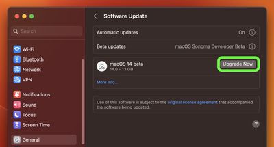 - Warten Sie, bis die Betaversion von macOS 14 im Bereich „Softwareaktualisierung“ angezeigt wird, und klicken Sie dann aufJetzt upgradenund befolgen Sie die Anweisungen auf dem Bildschirm.