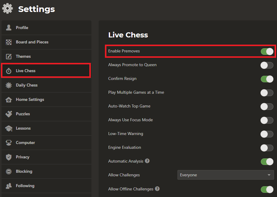 Suchen Sie den Schieberegler mit der Bezeichnung „Premoves“.Schieben Sie es in die Position „ON“.