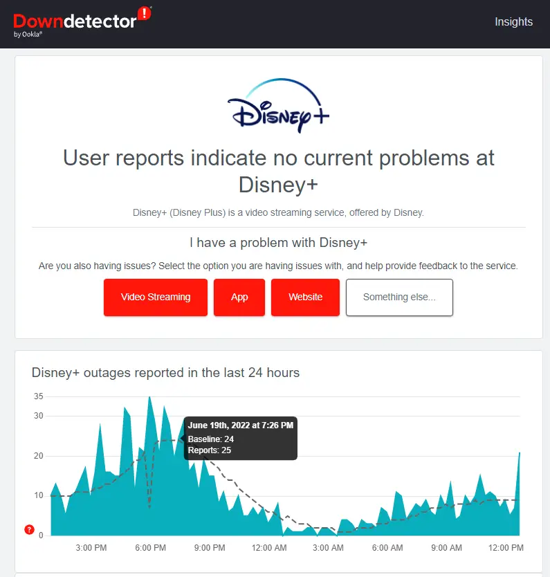 Sie müssen Anwendungen von Drittanbietern verwenden, zAbwärtsdetektorum den Serverstatus von Disney Plus zu überprüfen. Wenn der Disney Plus-Server ausgefallen ist, müssen Sie warten, bis der Server repariert ist. Da seitens des Benutzers nichts unternommen werden kann, kann das Problem durch Disney Plus behoben werden.