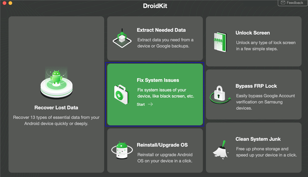 Geräte, bei denen das Android-Firmware-Update hängen bleibt, können darauf zurückzuführen sein, dass der Bootloader nicht funktioniert. Der Vorteil besteht darin, dass es beim Ausprobieren von DroidKit keine irreversiblen oder nicht behebbaren Probleme auf der Android-Plattform gibt.