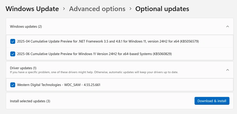 - Wählen Sie alle hier angezeigten Updates aus und klicken Sie auf die Schaltfläche „Herunterladen und installieren“.