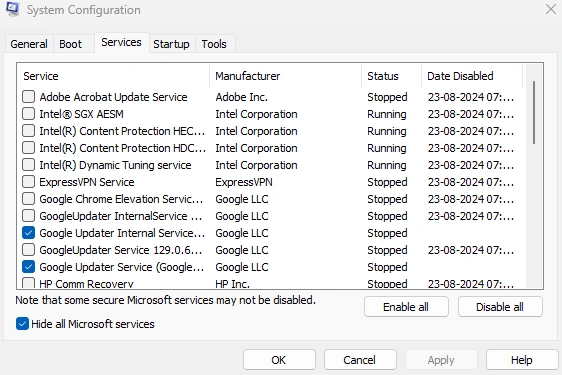 - Deaktivieren Sie alle Nicht-Microsoft-Dienste und klicken Sie auf OK.