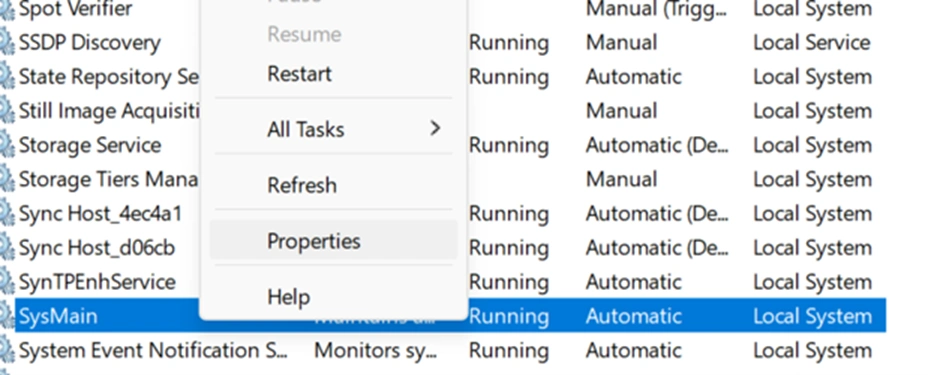 - Suchen Sie SysMain, klicken Sie mit der rechten Maustaste → Eigenschaften.