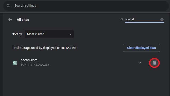 Geben Sie dort „OpenAI“ in die Suchleiste ein. Nachdem die relevanten Daten gefunden wurden, löschen Sie die Daten und Cookies der OpenAI-Website. Wenn Sie fertig sind, starten Sie Ihren Browser neu und starten Sie die ChatGPT-Webseite erneut.