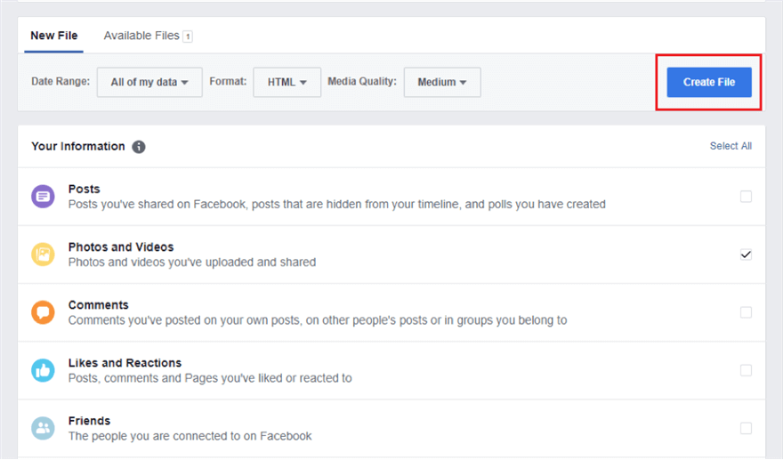 Schritt 4: Klicken Sie dann auf die Schaltfläche „Datei erstellen“, um den Downloadvorgang zu starten. Sie erhalten eine Benachrichtigung von Facebook, sobald die Datei zum Herunterladen auf den Computer bereit ist.