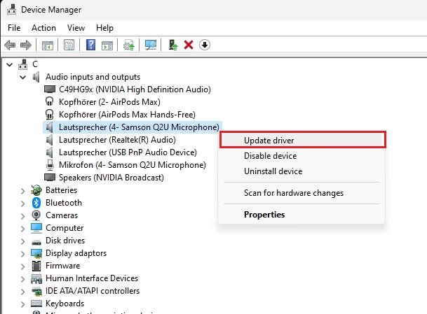 Gerätemanager > Audioeingänge und -ausgänge > Treiber aktualisieren