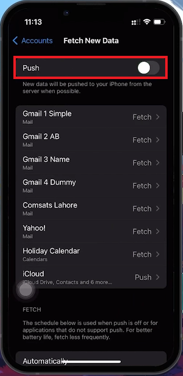 Passen Sie das Abrufen neuer Daten an:Deaktivieren Sie Push und wählen Sie ein weniger häufiges Abrufintervall aus, z. B. stündlich.