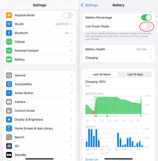 Der Energiesparmodus kann die Systemfunktionen, einschließlich der Bildschirmaufzeichnung, einschränken. Durch Ausschalten wird sichergestellt, dass Ihr iPhone über die volle Kapazität für die Bildschirmaufzeichnung verfügt, wodurch Leistung und Zuverlässigkeit verbessert werden. Hier erfahren Sie, wie es geht.