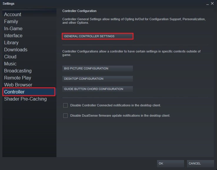 Öffnen Sie für Steam-Benutzer den Launcher und navigieren Sie zu IhremSteam-Einstellungen. ImReglerAbschnitt, klicken Sie aufAllgemeine Controller-Einstellungen.