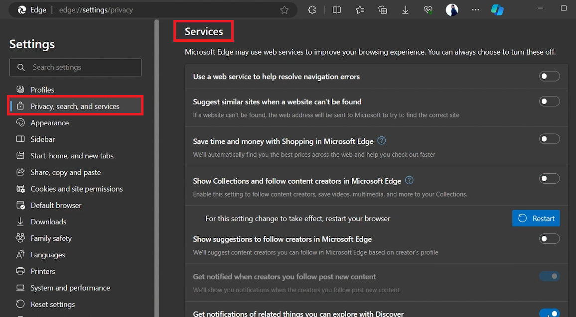 Deaktivieren Sie nicht benötigte Microsoft Edge-Dienste