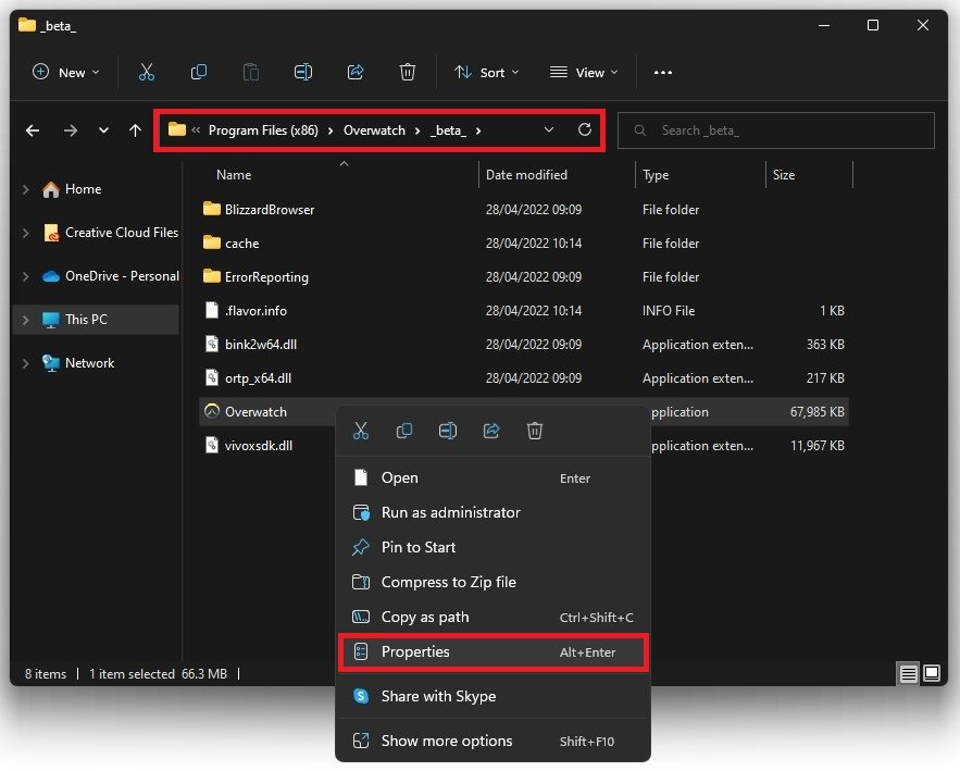 Öffne deineDatei-Explorerund navigieren Sie zu dem Laufwerk, auf dem Sie das Spiel gespeichert habenProgrammdateien>Overwatch>Beta. Klicken Sie mit der rechten Maustaste auf die Anwendung Overwatch.exe und gehen Sie zu ihrEigenschaften.