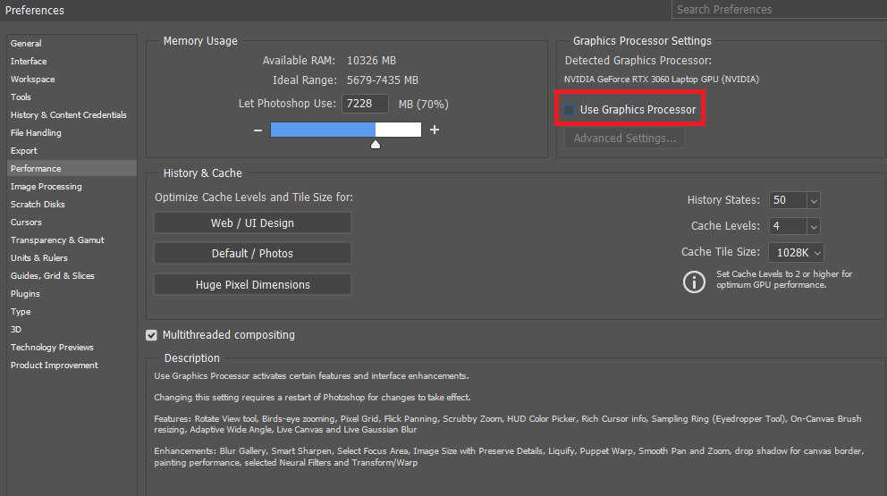 Photoshop-Einstellungen > Leistung > Grafikprozessoreinstellungen