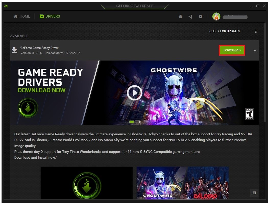 Nachdem Sie Ihre Änderungen übernommen haben, können Sie das Spiel schließen und sicherstellen, dass Ihr Grafiktreiber auf dem neuesten Stand ist. Es wird empfohlen, das zu verwendenGeForce-ErlebnisBewerbung für eineNVIDIA-GPU, Sie können aber auch die AMD-Treibersuite verwenden.