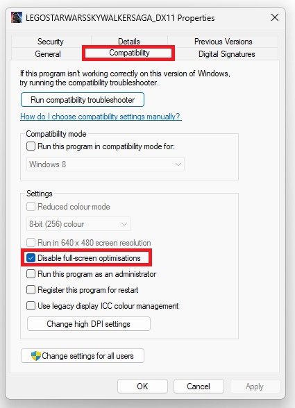 Stellen Sie sicher, dass Sie sich in der befindenKompatibilitätTab und wählen Sie ausDeaktivieren Sie Vollbildoptimierungenund übernehmen Sie Ihre Änderungen.