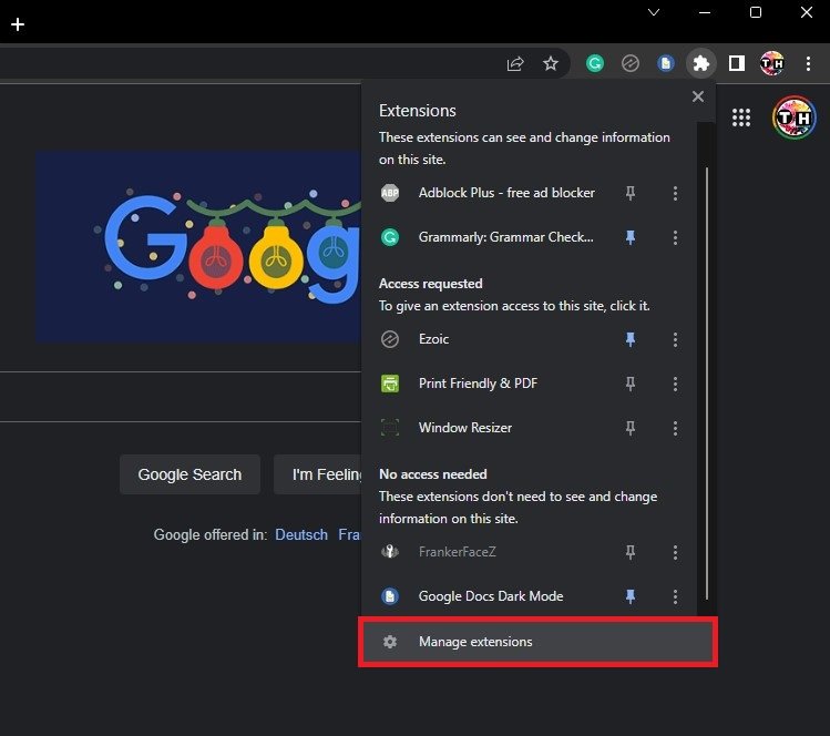 Wählen Sie in Chrome das Symbol der Erweiterung aus und klicken Sie aufErweiterungen verwalten. Deaktivieren Sie alle derzeit aktivierten Erweiterungen und versuchen Sie erneut, dem Roblox-Server beizutreten. Anschließend können Sie Ihre Erweiterungen erneut aktivieren, um herauszufinden, welche Erweiterung den Fehler verursacht.