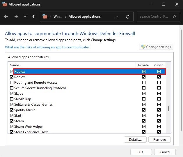 Suchen Sie in der Zwischenzeit in Ihrem Startmenü nach „Firewall“, um Ihre Suche zu öffnenFirewall- und NetzwerkschutzSystemeinstellungsfenster. Hier auswählenLassen Sie eine App durch die Firewall passieren. Klicken Sie in diesem Fenster aufEinstellungen ändern, suchen Sie nach Roblox und stellen Sie sicher, dass beide Kontrollkästchen aktiviert sind, bevor Sie dieses Fenster schließen.