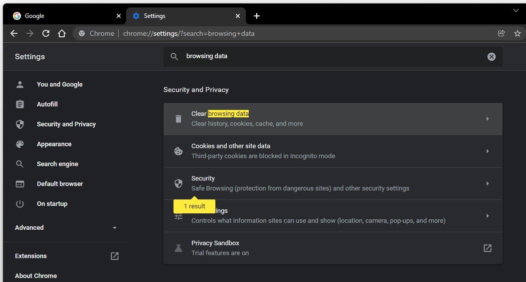 Suchen nachDurchsuchen, um auf Ihr zuzugreifenBrowserdaten löschenEinstellungen unterSicherheit und Datenschutz.