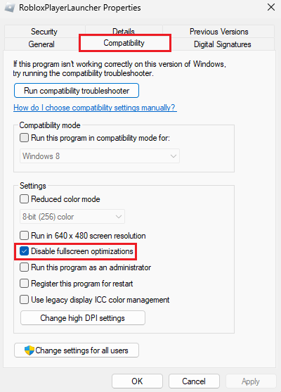 Wenn Sie alle oben genannten Schritte ausprobiert haben und RoShade immer noch die Zusammenarbeit verweigert, könnte das Problem mit dem Roblox-Client selbst zusammenhängen. An diesem Punkt könnte die Änderung Ihrer Roblox-Kompatibilitätseinstellungen die Lösung sein.