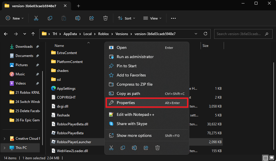 Sie werden zur Anwendung „RobloxPlayerLauncher.exe“ weitergeleitet. Klicken Sie mit der rechten Maustaste auf diese Anwendung, um auf ihre Eigenschaften zuzugreifen.