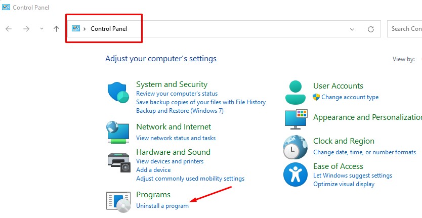 Schritt 2:Auf derBedienfeldWindows, wählen Sie die ausProgrammeOption undProgramm deinstallieren.