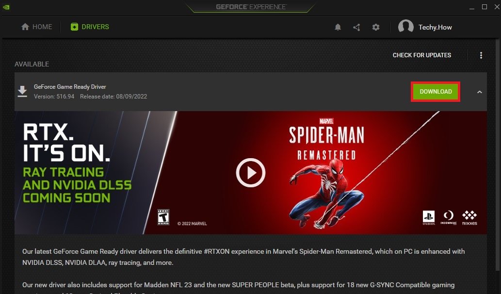Ich empfehle die Verwendung der GeForce Experience-Anwendung für Benutzer von NVIDIA-Grafikkarten und der AMD Radeon-Software für Benutzer von AMD Radeon-Grafikkarten. Ich werde zunächst auf die GeForce Experience-Anwendung für NVIDIA-GPU-Benutzer eingehen. Öffnen Sie die App und navigieren Sie zuTreiberTab. Klicken Sie hier aufHerunterladen. Es wird einen Moment dauern, den neuesten Grafiktreiber herunterzuladen und Sie werden gefragt, wie Sie ihn auf Ihrem System installieren. WählenExpress-Installation.
