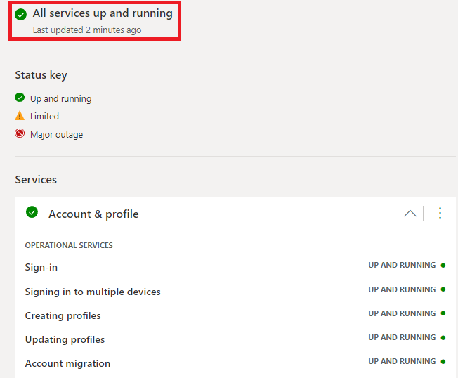 Vergewissern Sie sich zunächst, dass die Xbox Live-Server in Ihrer Region betriebsbereit sind, indem Sie die besuchenXbox-Statusseite. Stellen Sie sicher, dass der Xbox-Status aktiv ist und nicht eingeschränkt ist oder gewartet wird. Wenn ein Ausfall die „Konto- und Profil“-Dienste betrifft, müssen Sie warten, bis das Problem behoben ist.